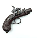Trigger pulls back but this gun was used quite a bit when I was a kid so doesn't quite snap fire. I don't know much else about this. If you recall the Pirates of the Carribbean ride at Disneyland in the late 80s, and the great gift shop it hand with the wooden guns....I was totally pirate crazy after that so when I found this at an antique store as a kid I begged my mom to get it for me.